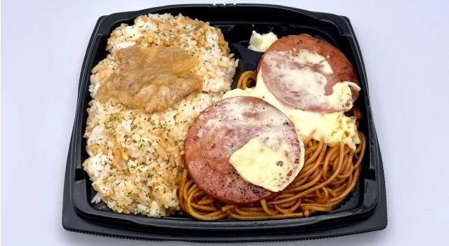 にんにく醤油だれがかかったご飯に、ソーセージステーキと生姜焼き、ソース味の焼きスパゲッティを組み合わせた、満足感のある大盛り弁当です。