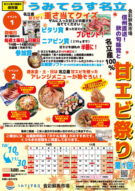 甘エビを使用したグルメイベント「名立産100%甘エビ祭り」が上越市名立区の道の駅うみてらす名立の食彩鮮魚市場で、10月10日(金)から11月30日(日)までの毎週金曜日から日曜日に開催されます。