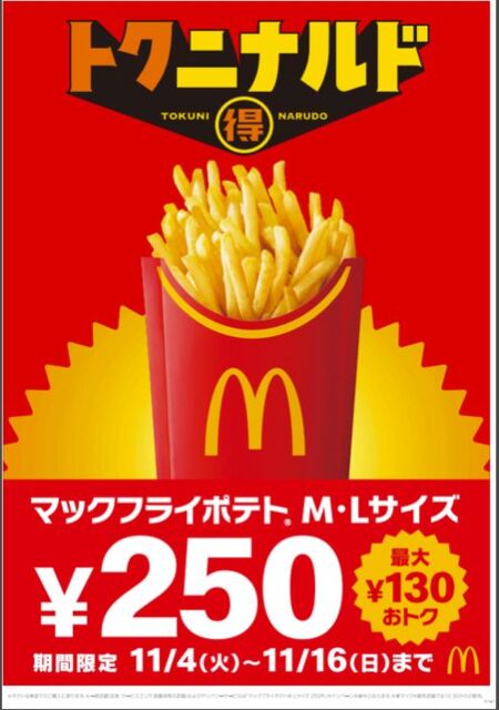 日本マクドナルド(東京都新宿区)が、人気商品がお得になる「トクニナルド」キャンペーンとして、11月4日から13日間限定で「マックフライポテト」M・Lサイズを、特別価格250円(以下税込み)で販売しています。