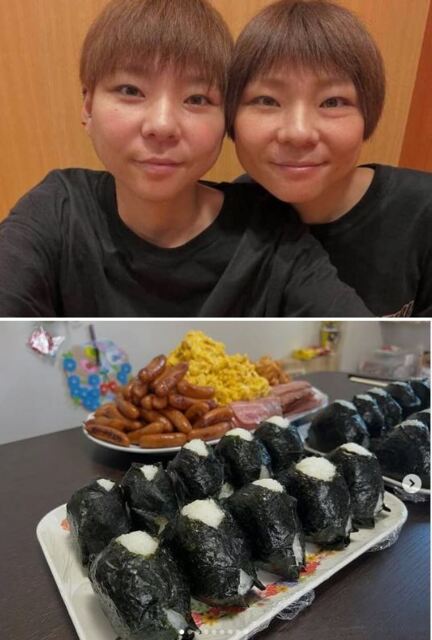 かこは「理想の朝食 おにぎり10合とウィンナー、からあげ、ベーコン、スクランブルエッグ!」とつづり、写真とともに紹介。続く投稿では、妹の小野あことともに食べ進める様子も公開した。