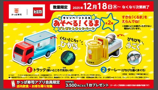 「かっぱ寿司 キャンペーン トミカ “あそべる!くるま”プレゼントキャンペーン」が12月18日より再開