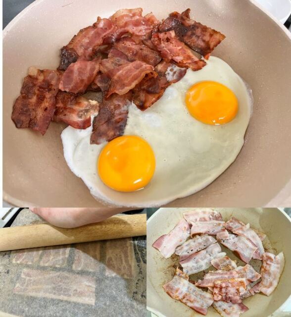 1. まな板にベーコンを並べ、その上にクッキングシートを重ねます。その上からめん棒でしっかり圧をかけながら転がし、ベーコンの繊維を潰すようにして薄くのばします。