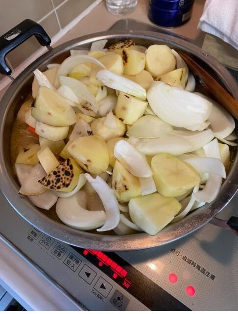 写真には大量の具材を鍋で煮込む様子が写っており、和田さんは「ジャガイモ16個、玉ねぎ10個、にんじん4本、お肉2キロ、ふぅ」とコメントしました。