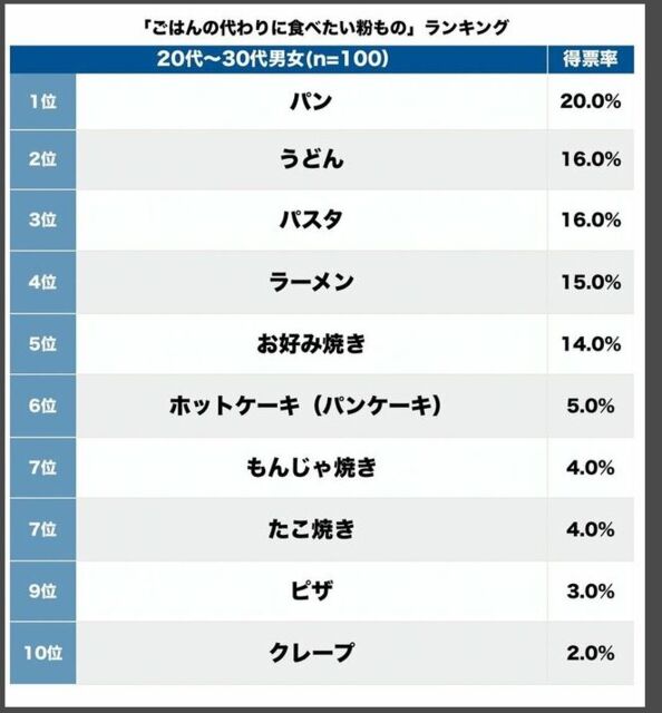 コメの高値が依然として続き、家計をひっ迫している中、小麦粉メニューに頼っている人も多そう。そこで今回は20〜30代の男女100人に「ごはんの代わりに食べたい粉もの」について聞いてみた。(自社リサーチ)