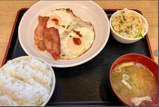 さて、主役の目玉焼きがダブルの朝定食は、見た目からしてシンプルそのものですが、食べ始めるとその良さを改めて実感。フワトロ仕上げで黄身がとろけるように溢れ出します。相方のベーコンはカリッと香ばしく焼き上げられて、ほど良い塩味が食欲をそそります。目玉焼きとベーコンの組み合わせはテッパンです(つまりベーコンエッグ)。