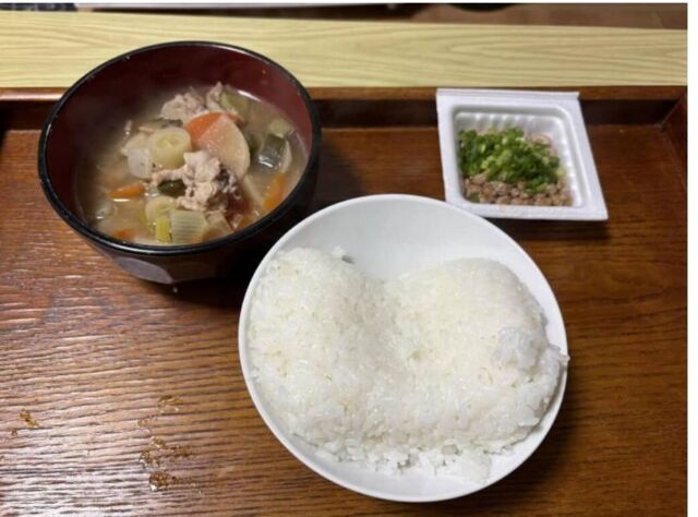 投稿されていた写真には、レンチンした冷凍ごはんと青ネギが乗った納豆、そして豚汁が! 投稿者さんが「頑張って作った」と話す豚汁の中には、大根やにんじん、白ネギなどのたっぷり野菜の他、こんにゃくや豚肉などかなりの具だくさん。肌寒い冬の時期に体も心もあたたまる、とってもおいしそうな1杯に仕上がっています。見ているとおなかが空いてきちゃいそうですね。